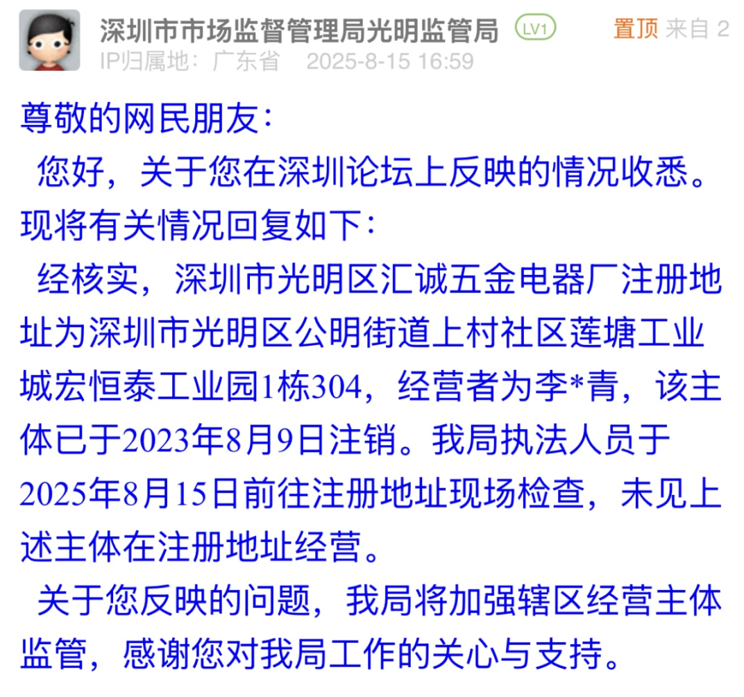優(yōu)化建議:深圳市市場(chǎng)監(jiān)督管理局光明管理局的回應(yīng)中,核實(shí)了涉事電器廠已注銷,且不在注冊(cè)地經(jīng)營(yíng),也提及加強(qiáng)轄區(qū)主體監(jiān)管,但市民反映的排插套用注銷主體信息銷售、違規(guī)標(biāo)識(shí)3C標(biāo)志等關(guān)鍵問題,未得到明確解答。若回應(yīng)中能豐富指引類內(nèi)容,如告知市民可向平臺(tái)追責(zé)的途徑、提交證據(jù)的具體方式,為市民維權(quán)提供清晰方向,將更貼合市民需求,也能讓回應(yīng)更具實(shí)際意義。