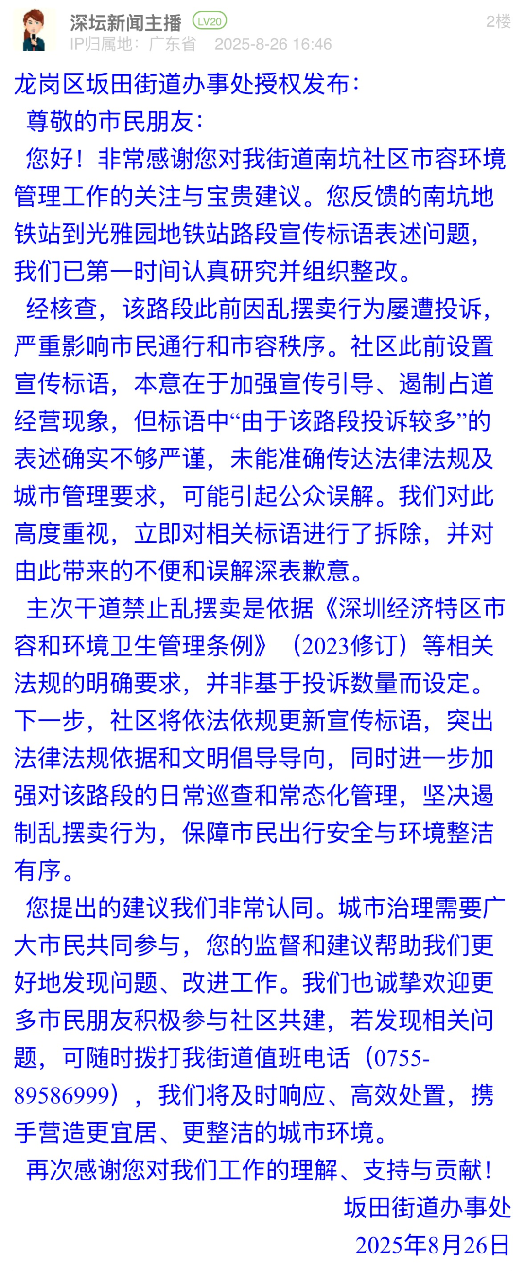 案例點(diǎn)評(píng):標(biāo)語表述不嚴(yán)謹(jǐn)可能引發(fā)公眾誤解,坂田街道辦展現(xiàn)出高效務(wù)實(shí)的態(tài)度,第一時(shí)間拆除涉事標(biāo)語,計(jì)劃更新標(biāo)語,明確標(biāo)語中提及的禁擺依據(jù)為法規(guī)要求而非投訴數(shù)量?;貞?yīng)中,街道主動(dòng)致歉并公開整改邏輯,展現(xiàn)“直面問題不推諉”的擔(dān)當(dāng),更以“邀請(qǐng)市民參與共建”為切入點(diǎn),構(gòu)建“政府主導(dǎo)+公眾監(jiān)督”的治理閉環(huán)。此次整改有效化解因標(biāo)語表述不當(dāng)引發(fā)的公眾疑慮,彰顯了“以民為師”的共治智慧。