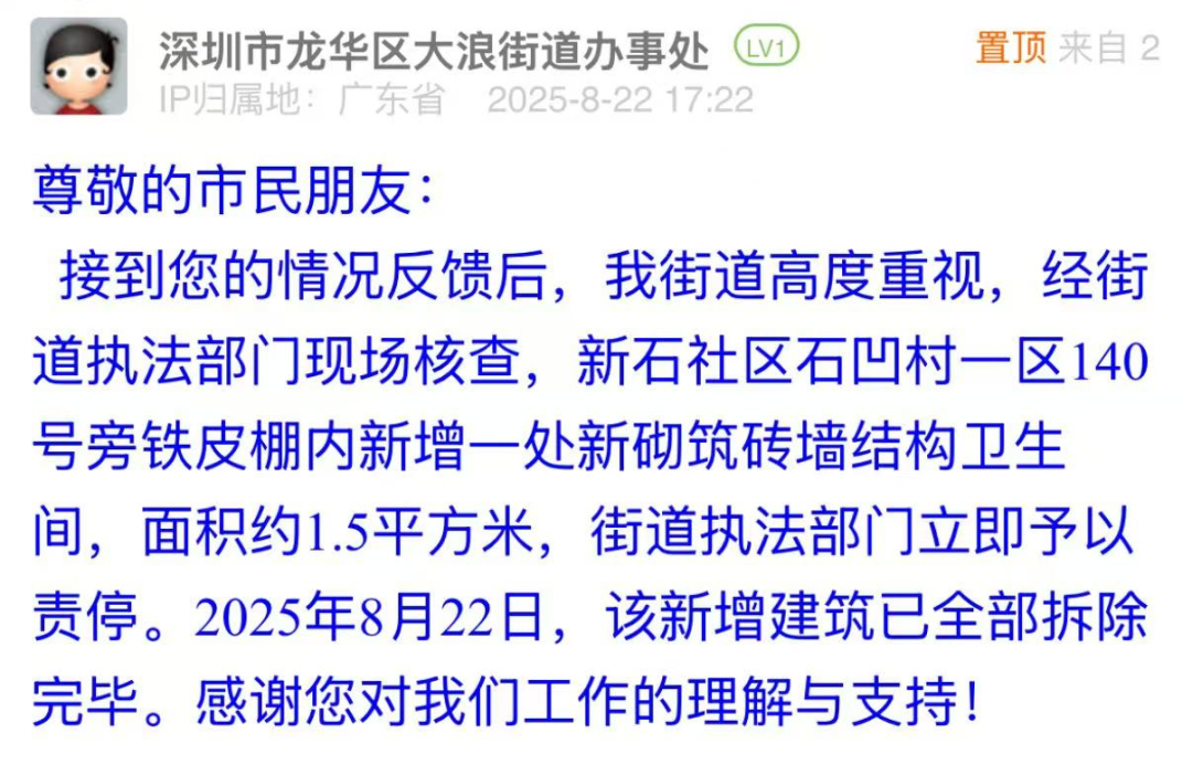 案例點(diǎn)評(píng):8月21日晚間,市民發(fā)布帖文反映違建問題,大浪街道以“雷霆處置”展現(xiàn)安全至上的治理?yè)?dān)當(dāng)。接到投訴后,街道迅速核查,在22日給出回應(yīng),表示已完成拆除工作,做到了“速辦速結(jié),質(zhì)效雙優(yōu)”。此次響應(yīng)既體現(xiàn)“隱患即事故”的底線思維,更以“發(fā)現(xiàn)即拆除”的高效行動(dòng),彰顯基層治理對(duì)民生安全的敏銳感知與果斷處置能力,切實(shí)筑牢居民“身邊安全”防線。