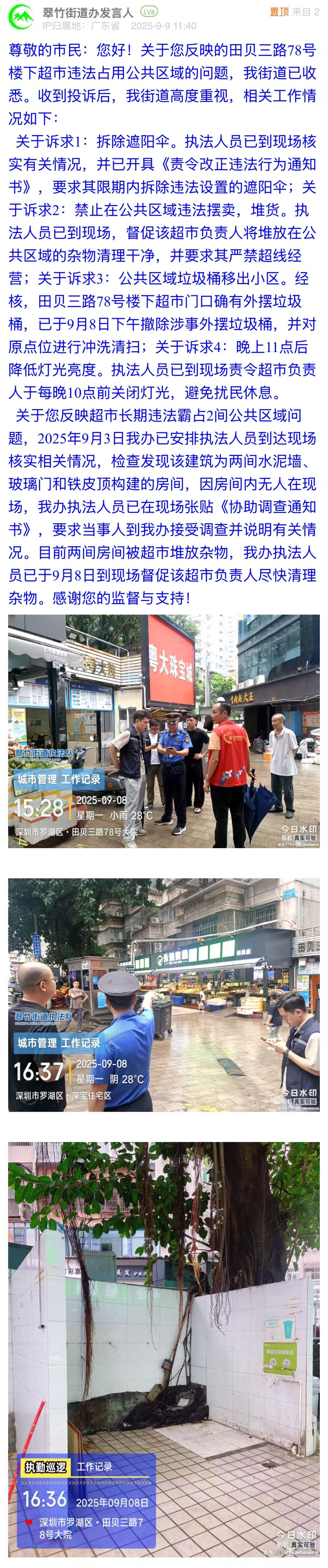 案例點(diǎn)評(píng):本案例中,翠竹街道辦立足市民訴求,對(duì)違規(guī)搭建遮陽(yáng)傘、占用公共區(qū)域、違規(guī)堆放垃圾、店面燈牌亮度過(guò)高這四個(gè)問(wèn)題,街道均做到快速響應(yīng),并以圖片展示治理效果?;貞?yīng)既體現(xiàn)了基層執(zhí)法的規(guī)范性與時(shí)效性,又展現(xiàn)了對(duì)民生細(xì)節(jié)的關(guān)注力,踐行了“小事不小辦、事事有回音”的理念,為同類民生訴求的解決提供了可借鑒范式。