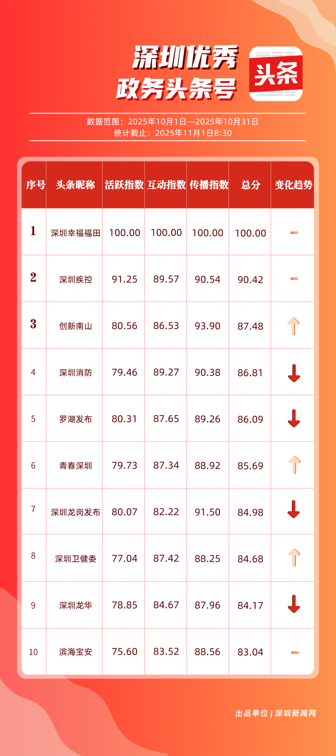 10月,“深圳幸福福田”“深圳疾控”“創(chuàng)新南山”“深圳消防”“羅湖發(fā)布”“青春深圳”“深圳龍崗發(fā)布”“深圳衛(wèi)健委”“深圳龍華”“濱海寶安”共10個(gè)政務(wù)頭條號(hào)入選“優(yōu)秀政務(wù)頭條號(hào)”榜單?!吧钲谛腋8L铩痹诨钴S、互動(dòng)、傳播均收獲較好成果,蟬聯(lián)榜首;“深圳疾控”得分超90分,持續(xù)發(fā)布民生健康類內(nèi)容,為市民健康保駕護(hù)航;“創(chuàng)新南山”內(nèi)容創(chuàng)作緊扣民生與區(qū)域特色,位列榜單第三名。“深圳消防”“羅湖發(fā)布”等賬號(hào)也位列榜單前列,成為區(qū)域政務(wù)新媒體內(nèi)容創(chuàng)新、信息傳遞的標(biāo)桿。