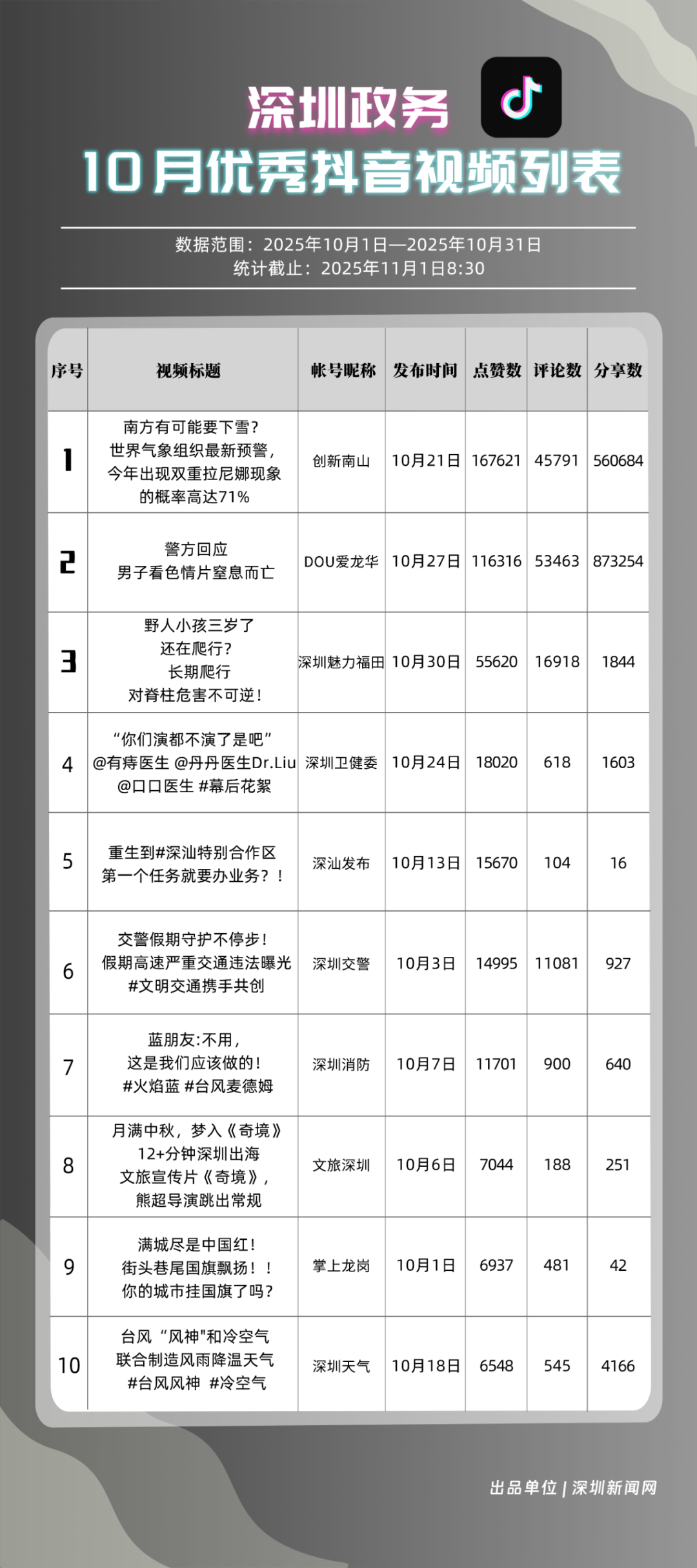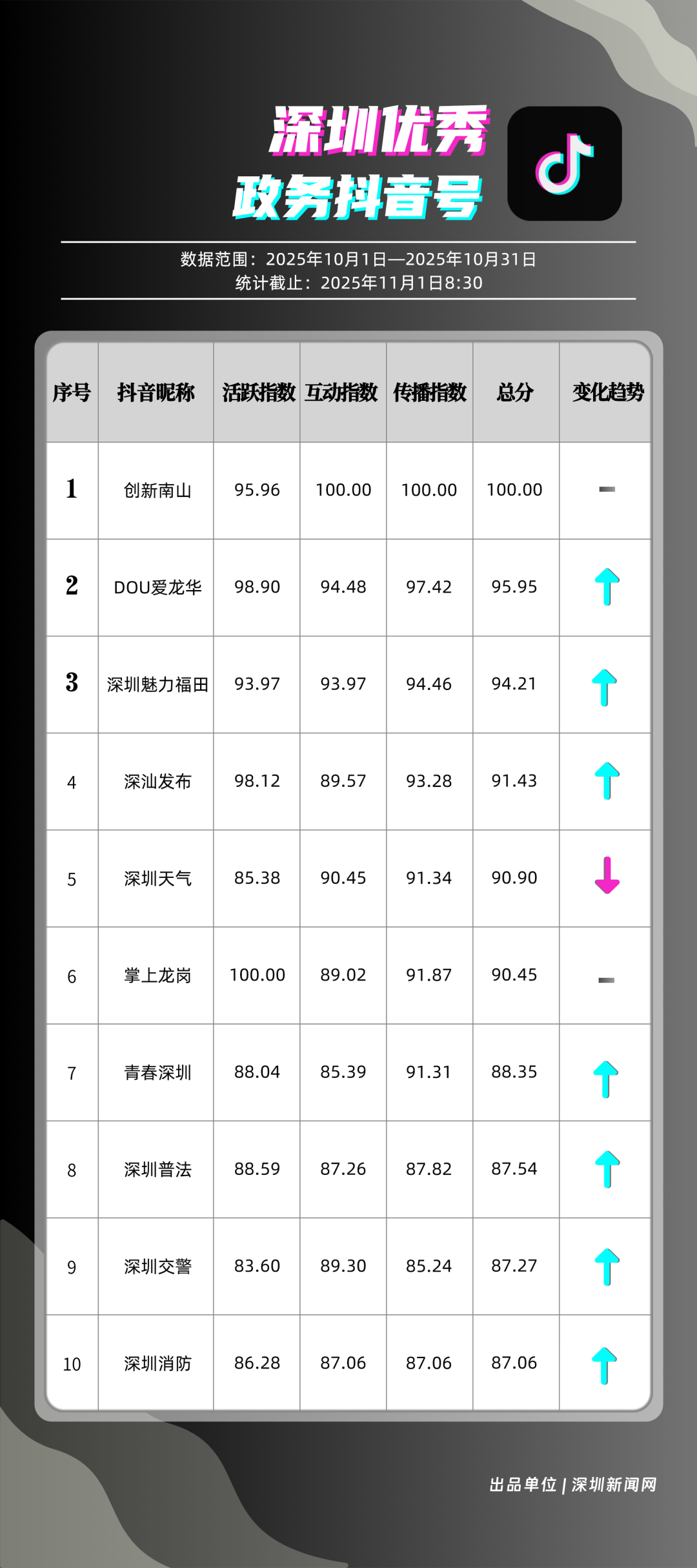 10月,獲得“優(yōu)秀政務(wù)抖音號(hào)”稱號(hào)的是“創(chuàng)新南山”“DOU愛龍華”“深圳魅力福田”“深汕發(fā)布”“深圳天氣”“掌上龍崗”“青春深圳”“深圳普法”“深圳交警”“深圳消防”?!皠?chuàng)新南山”以總分100分居于榜首,展現(xiàn)出其內(nèi)容創(chuàng)作對用戶的強(qiáng)大吸引力與傳播力;“DOU愛龍華”與“深圳魅力福田”分別位列第二、三位,得分在95分左右,排名較上期有所上升。“深汕發(fā)布”“深圳天氣”“掌上龍崗”等賬號(hào)得分均在90分以上,以年輕化表達(dá)展示實(shí)用信息,也收獲較好互動(dòng)、傳播成績。