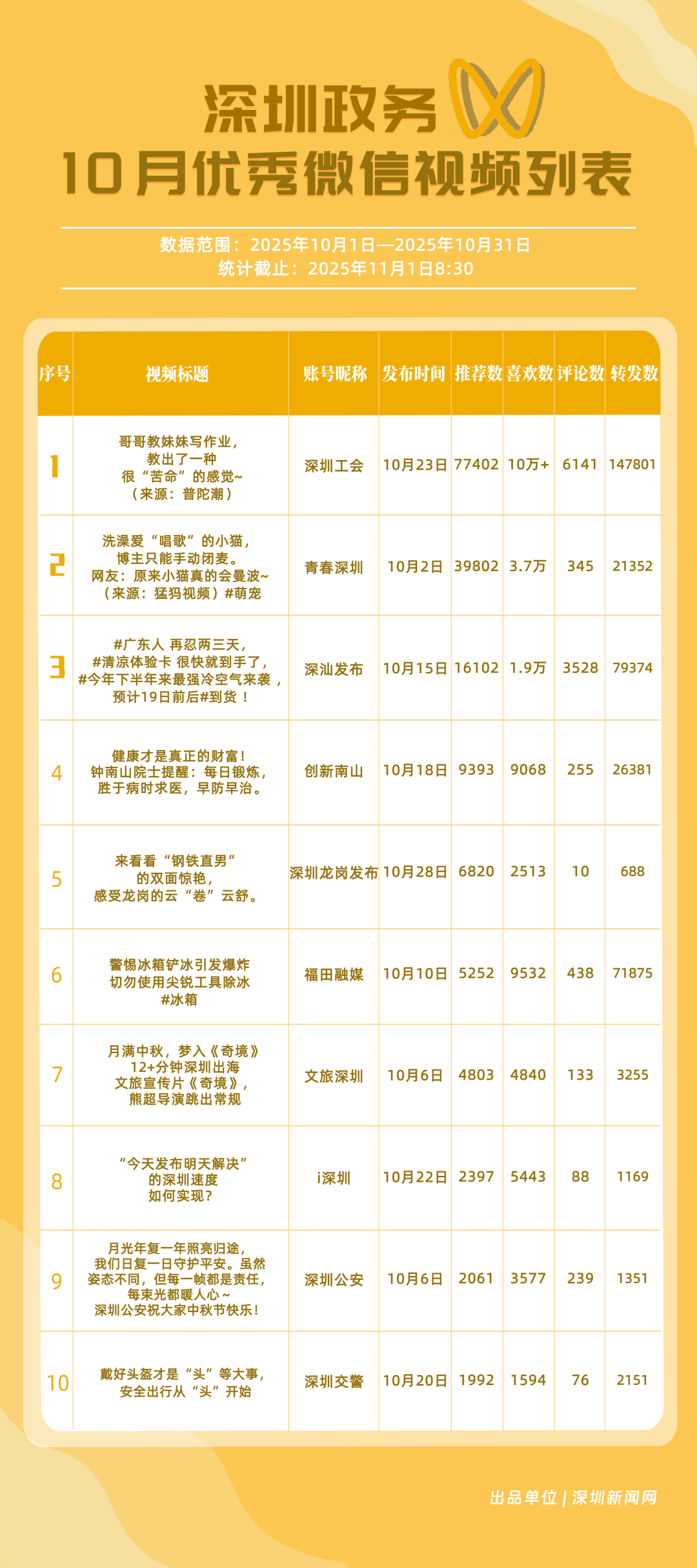 2025年10月期《深圳優(yōu)秀政務(wù)新媒體矩陣》正式發(fā)布,上榜矩陣以深度創(chuàng)新的傳播思路與精細(xì)化的服務(wù)持續(xù)領(lǐng)跑,為政務(wù)新媒體行業(yè)貢獻(xiàn)了可復(fù)制的實(shí)踐經(jīng)驗(yàn),深化政務(wù)信息與公眾喜好的精準(zhǔn)對接,為深圳政務(wù)新媒體高質(zhì)量發(fā)展注入新動(dòng)能與新活力。