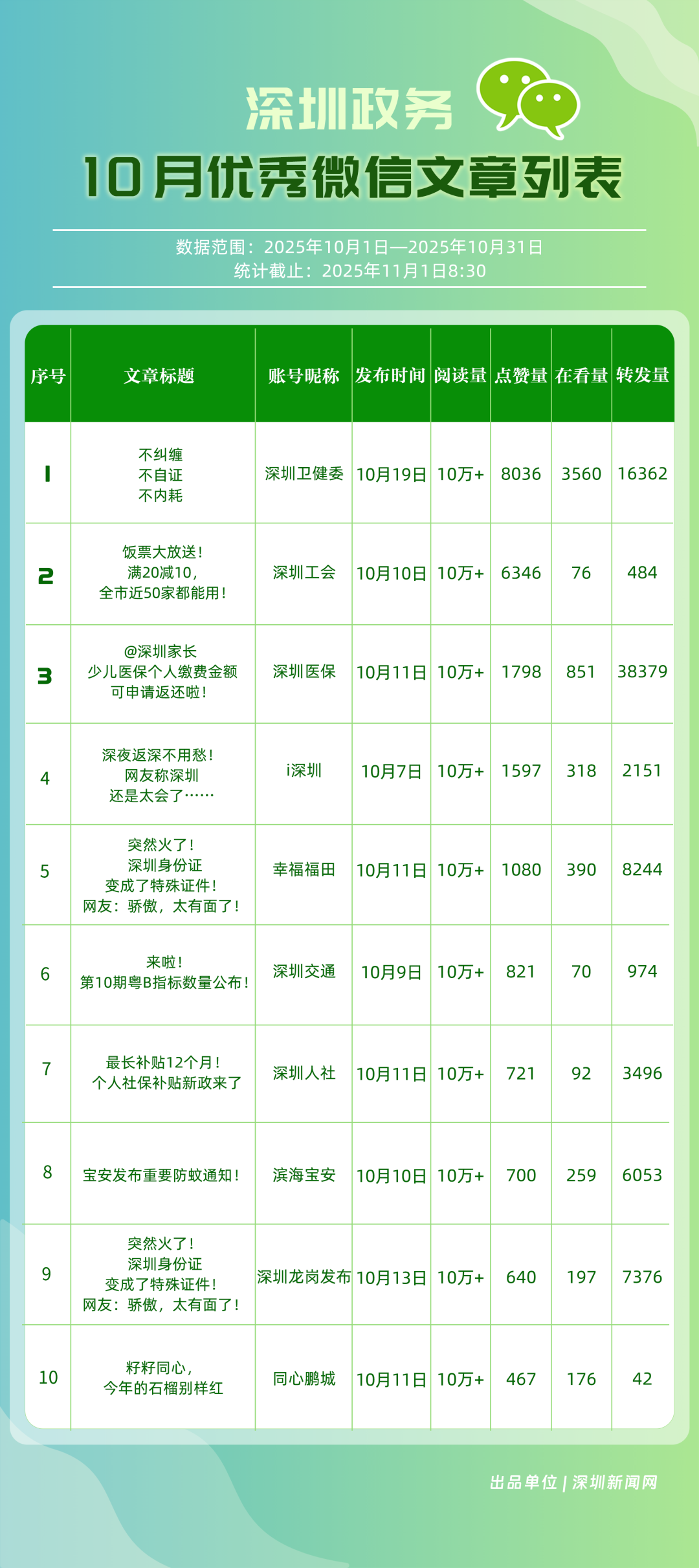 10月,“深圳衛(wèi)健委”“深圳龍崗發(fā)布”“i深圳”“幸福福田”“深圳工會(huì)”“青春深圳”“創(chuàng)新南山”“濱海寶安”“深圳龍華”“深圳光明”等30個(gè)政務(wù)微信公眾號(hào)榮登“深圳優(yōu)秀政務(wù)微信公眾號(hào)”榜單。10月,“深圳衛(wèi)健委”以總分100位居榜首,其持續(xù)以真誠、反套路的內(nèi)容,將專業(yè)健康知識(shí)轉(zhuǎn)化為網(wǎng)民喜聞樂見的“生活指南”,受到大量網(wǎng)民喜愛;“深圳龍崗發(fā)布”位居第二,持續(xù)發(fā)布高質(zhì)量內(nèi)容,成為市民獲取龍崗動(dòng)態(tài)的“第一窗口”;“i深圳”也發(fā)布政策、民生內(nèi)容,排名有所上升,位列第三;“幸福福田”“深圳工會(huì)”等也立足區(qū)域特色,通過多元內(nèi)容,展現(xiàn)各自的發(fā)展活力。