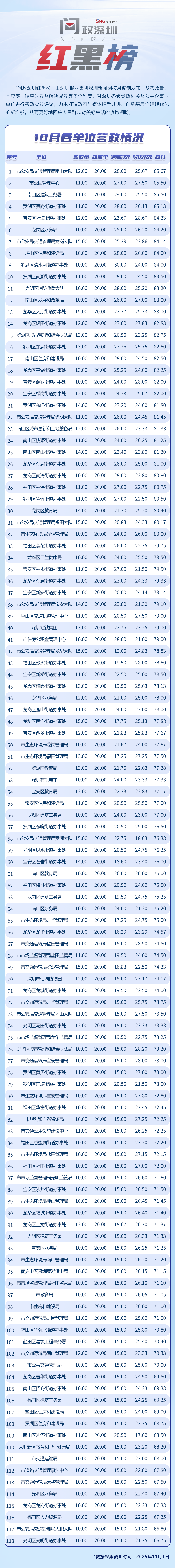 “問政深圳紅黑榜”具有科學、合理、完備的綜合評價體系,能夠綜合評估深圳各級黨政機關(guān)和公共企事業(yè)單位的答政情況。