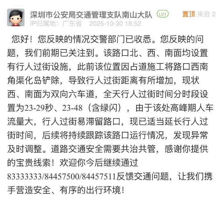 案例點評:南山交管部門在24小時內(nèi)對市民所反饋的問題進行答復(fù),展現(xiàn)出精準、高效的治理態(tài)度,既說明過街時間短的原因,又根據(jù)該路口在高峰期人流大的實際情況,適當延長過街時間,體現(xiàn)出“因需調(diào)整、務(wù)實便民”的理念?;貞?yīng)中,該部門還強調(diào)后續(xù)將持續(xù)跟蹤路口通行情況、及時優(yōu)化調(diào)整等,展示了精細化治理的決心和理念。