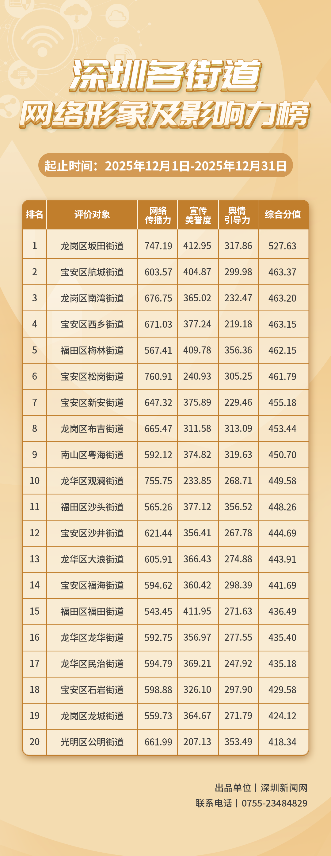 為深入了解深圳市各街道的網絡形象構建狀況和社會影響,推動街道治理“提質增效”,增強城市高質量發(fā)展動能,深圳新聞網編制推出《深圳各街道網絡形象及影響力榜》。榜單具有獨立客觀的評價體系,通過數據采集和分析,評估各街道的網絡傳播力、宣傳美譽度及輿情引導力,并對全市11個區(qū)共78個街道的網絡形象及影響力進行綜合排名。
