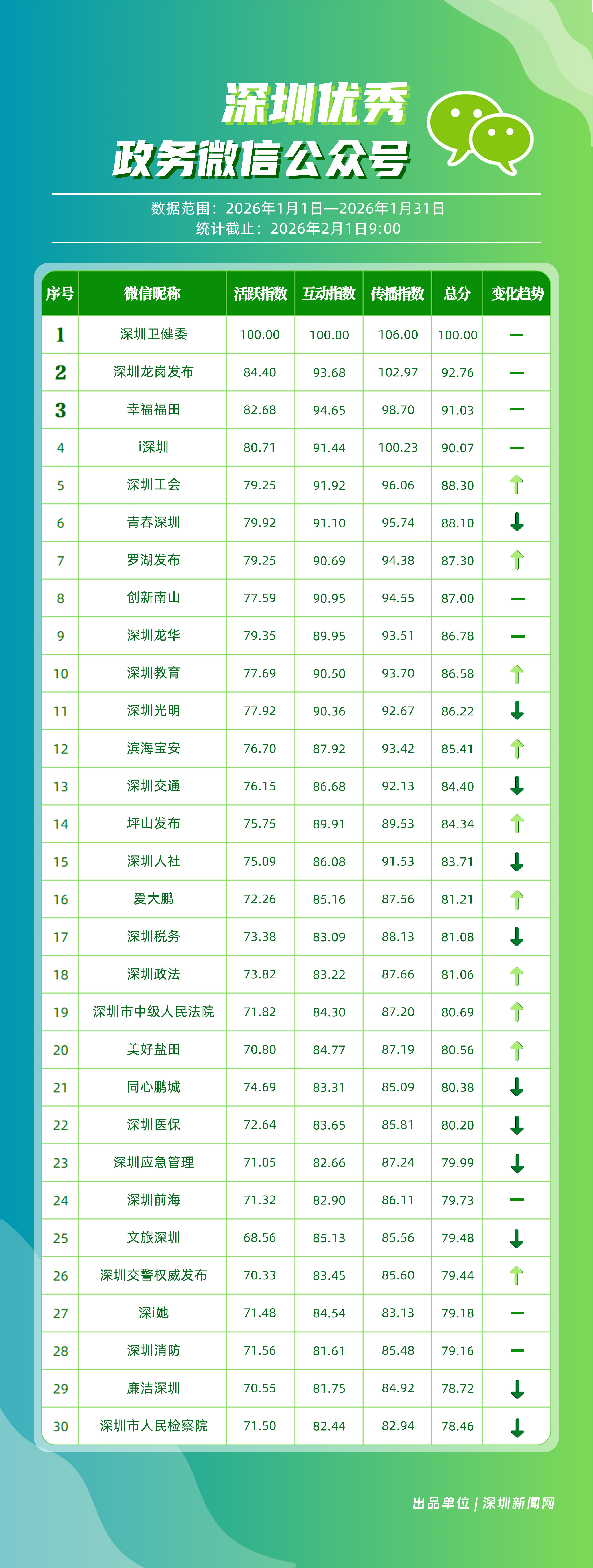 2026年1月,“深圳衛(wèi)健委”“深圳龍崗發(fā)布”“幸福福田”“i深圳”“深圳工會”“青春深圳”“羅湖發(fā)布”“創(chuàng)新南山”“深圳龍華”“深圳教育”等30個政務微信公眾號榮登“深圳優(yōu)秀政務微信公眾號”榜單。1月,頭部賬號“深圳衛(wèi)健委”繼續(xù)保持領先優(yōu)勢,1月份有59篇文章閱讀量突破10萬次,總分100分,穩(wěn)居榜首;“深圳龍崗發(fā)布”在互動與傳播方面表現(xiàn)依然出色,總分102.97分,位列第二;“幸福福田”憑借均衡、穩(wěn)健的運營,在互動與傳播方面表現(xiàn)優(yōu)異,總分91.03分,排名第三。同時,“深圳工會”與“羅湖發(fā)布”等賬號排名相較2025年12月有所提升。上榜微信公眾號持續(xù)深耕內(nèi)容與服務,不斷拓展發(fā)布維度與深化應用場景,在提升政務信息傳播效能、精準對接民生需求方面,發(fā)揮了關鍵作用。
