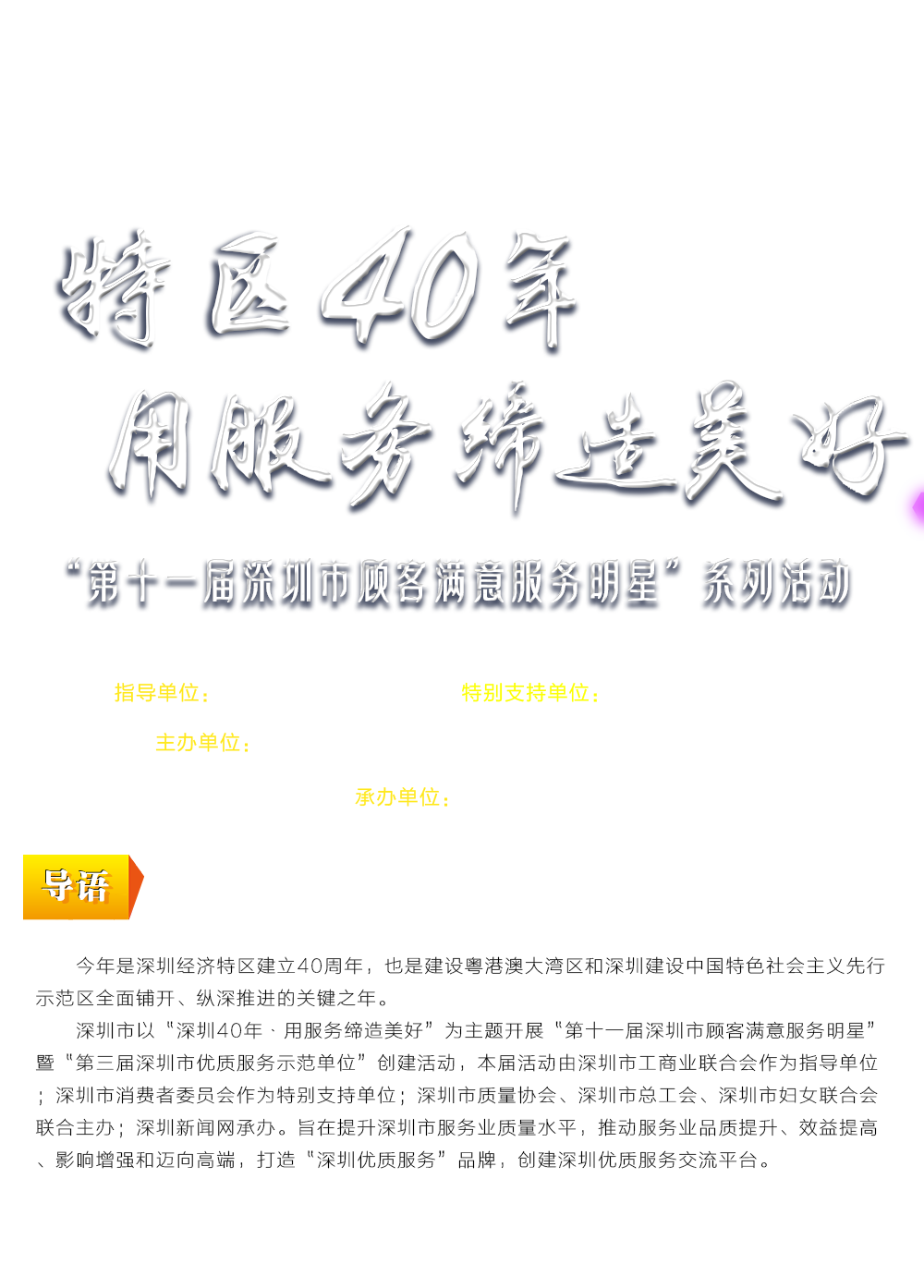 第十一屆顧客滿意服務明星活動現(xiàn)場深圳市政協(xié)常委、深圳市質量協(xié)會執(zhí)行會長李榕致辭200余人參加第十一屆顧客滿意服務明星活動頒獎典禮深圳機場、深圳燃氣、華夏銀行深圳分行榮獲“優(yōu)質服務示范單位”稱號廣東省深圳市深圳公證處等22家單位獲得“顧客滿意服務明星單位”稱號陳傳龍、陳繁華等10位同志獲得“第十一屆深圳市顧客滿意服務杰出管理者”稱號“生命之星”班組等50個團隊獲得“明星團隊”稱號陳華等70位同志獲得“第十一屆深圳市顧客滿意服務明星(個人)”稱號