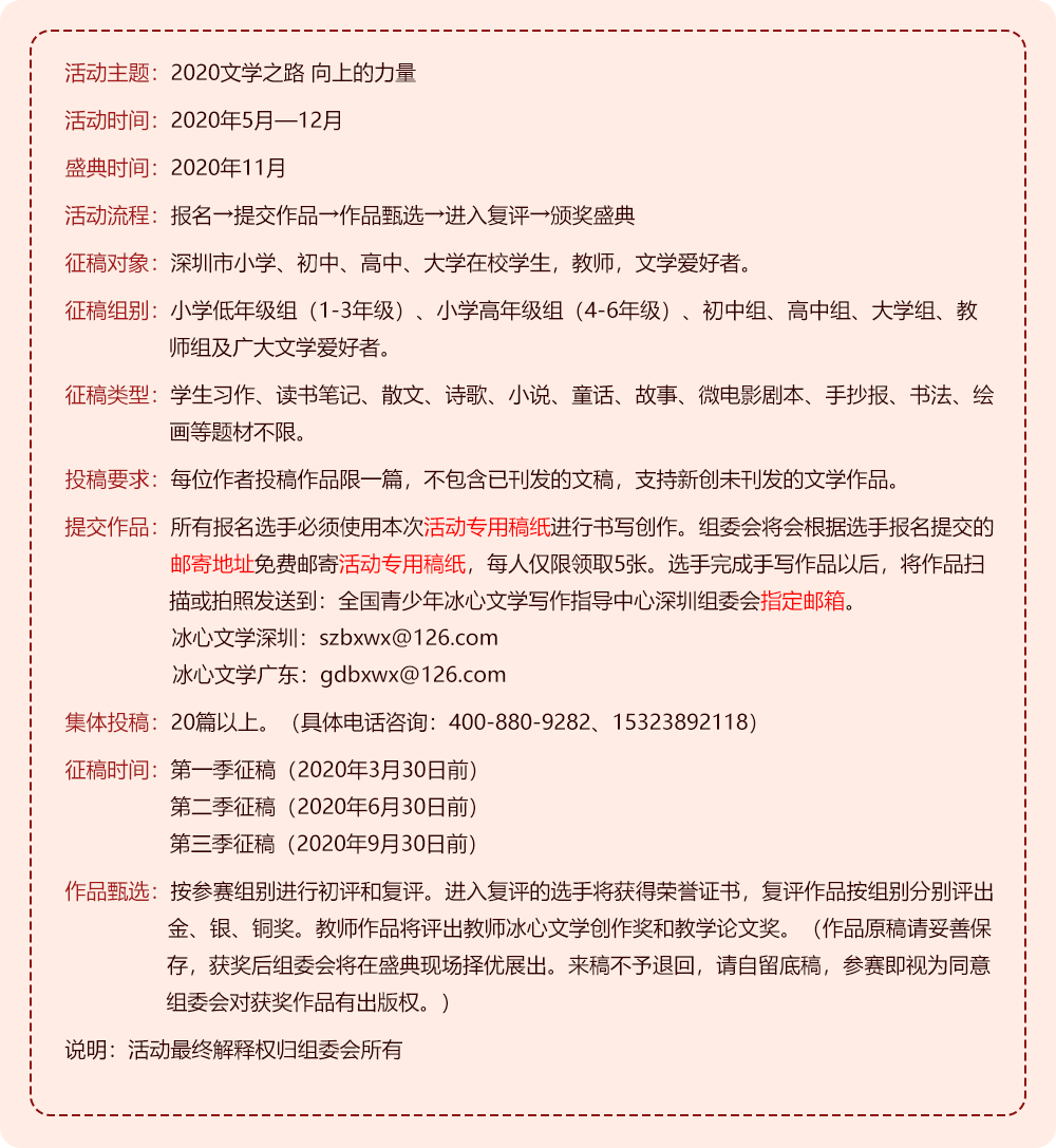 “第十五屆全國青少年冰心文學(xué)盛典”面向深圳市小學(xué)、初中、高中、大學(xué)學(xué)生,以及教師和文學(xué)愛好者,征集習(xí)作、讀書筆記、散文、詩歌、小說、童話、故事、微電影劇本、手抄報(bào)、書法、繪畫等。組委會(huì)將組織“第十五屆全國青少年冰心文學(xué)盛典·校園專場(chǎng)”、“專家分享會(huì)”、“文學(xué)之路·向上的力量——專家進(jìn)校園”、“第十五屆全國青少年冰心文學(xué)盛典·頒獎(jiǎng)典禮”、“優(yōu)秀作品校園巡展”等系列活動(dòng)>>>