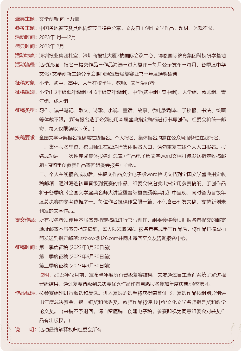 2023年度全國(guó)文學(xué)盛典”是面向小學(xué)、初中、高中學(xué)生,以及教師和文學(xué)愛(ài)好者而開展的文學(xué)系列活動(dòng),將文學(xué)的魅力持續(xù)傳播。廣大文學(xué)愛(ài)好者自愿報(bào)名參加。在本屆活動(dòng)進(jìn)程中,將繼續(xù)為孩子和文學(xué)愛(ài)好者們創(chuàng)建其熱愛(ài)的中華文化文學(xué)創(chuàng)作的滋養(yǎng)平臺(tái),為文學(xué)愛(ài)好者和優(yōu)秀的文學(xué)特長(zhǎng)生提供更廣闊的創(chuàng)作實(shí)踐平臺(tái)。教育界學(xué)術(shù)研究領(lǐng)域?qū)<医淌凇⒆骷?、?shī)人、文學(xué)評(píng)論家等組成的專家評(píng)審委員會(huì)本著公開、公平、公正的原則,對(duì)參評(píng)作品進(jìn)行審評(píng)。 組委會(huì)在廣大師生文友的支持與建議下,“2023年度全國(guó)文學(xué)盛典”將持續(xù)開展系列文創(chuàng)主題活動(dòng):“全國(guó)文學(xué)盛典之走進(jìn)名師”“全國(guó)青少年冰心文學(xué)盛典2023”、教育部創(chuàng)刊中國(guó)校園文學(xué)《一起向未來(lái)·中國(guó)校園文學(xué)》主題征投稿、“校園專場(chǎng)”“專家分享會(huì)”“文學(xué)創(chuàng)新 向上力量——專家進(jìn)校園”“全國(guó)文學(xué)盛典·各季品質(zhì)典禮”“優(yōu)秀作品校園巡展”等等。為參賽選手提供廣泛的交流、學(xué)習(xí)、鍛煉機(jī)會(huì)和展示平臺(tái)。>>>